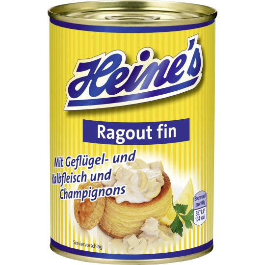 Heine`s Ragout fin ist tafelfertig und muss nur noch langsam erhitzt werden. Je nach Geschmack unter Zugabe von etwas Milch oder Sahne.
